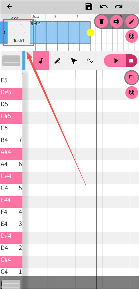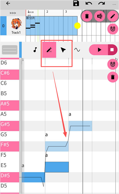7、点击音符旁边的曲线图标,可以进入参数曲线编辑界面,对音高、音量等进行精细调节。