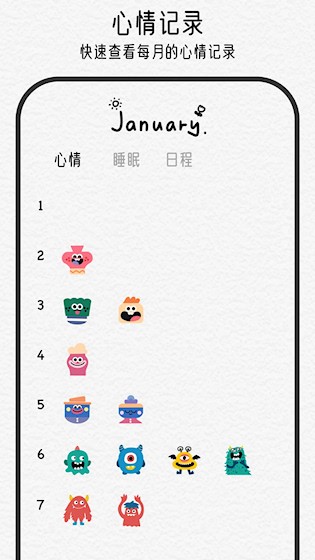 4、心情追踪:每日可选不同图标标记情绪状态,自动生成心情曲线,辅助用户观察心理变化趋势。