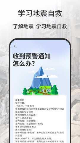 1、用户可以在应用中了解各种类型地震警报的示范、地震相关知识以及灾害解决方案等内容。