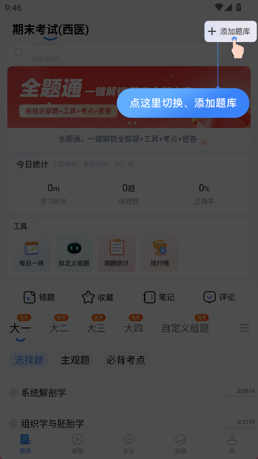 2、进入应用后可以点击右上角添加题库