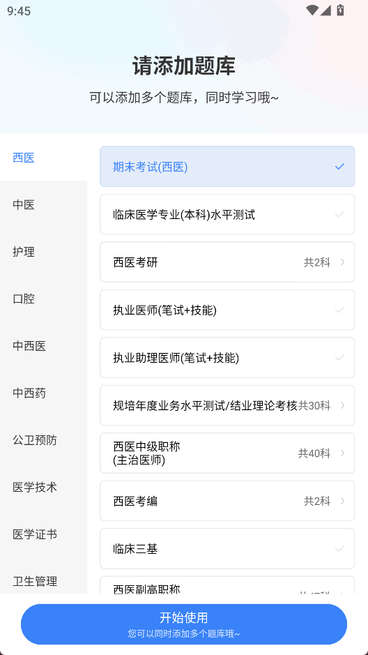 1、第一次进入应用,需要选择题库