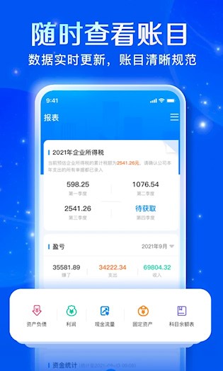 3、报表生成:实时输出资产负债表与利润表,支持按部门或项目维度统计。