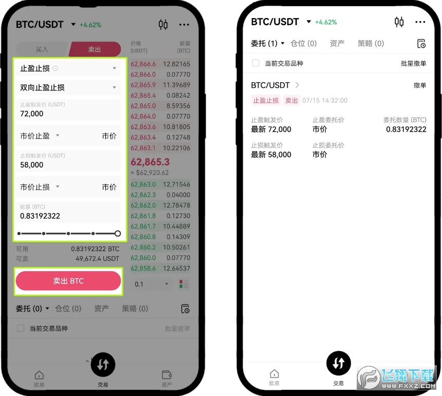 打开 App 现货交易页面,点选【止盈止损】和【双向止盈止损】, 输入【止盈触发价格】、【止损触发价格】以及数量,然后点击【卖出】。