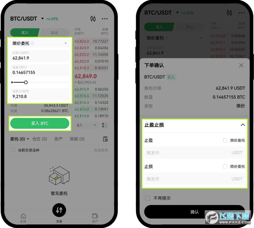 在【下单确认】里点击【止盈止损】― 输入【止盈触发价格】、【止损触发价格】 ― 点击【确认】。