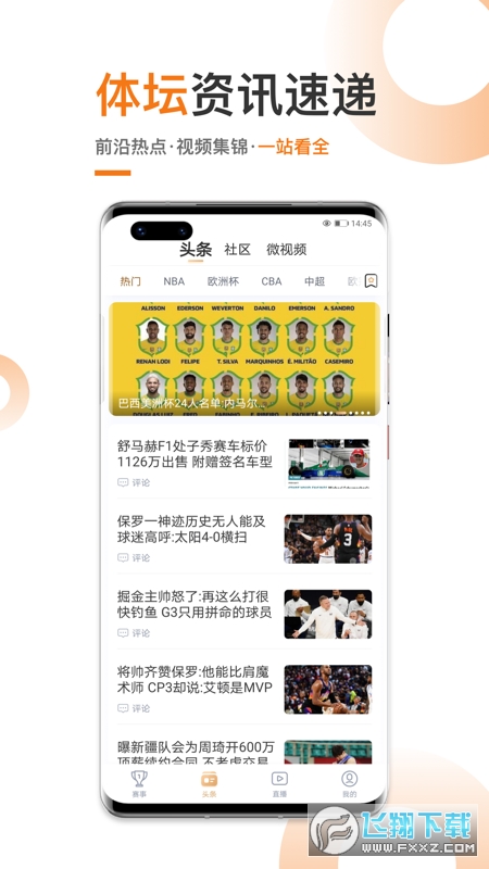 英超、中超、德甲、意甲、法甲、西甲、欧洲杯、NBA、CBA等海量体育赛事资讯、视频实时推送,24小时欢乐不断。
