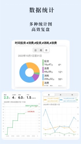 5、数据报表:按日周月维度生成饼图与柱状图,展示各类活动占比,辅助调整时间分配。