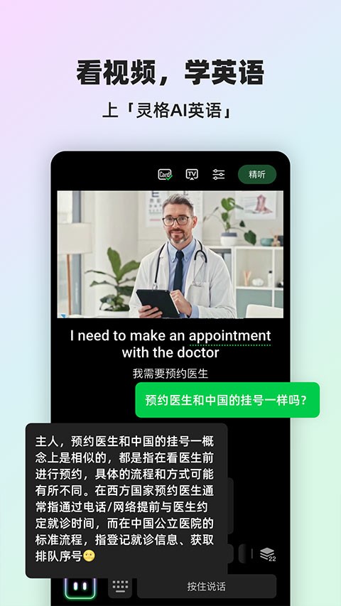 灵格AI英语是一款主打“趣味视频+AI陪伴”的英语学习平台,为不同水平学习者打造高效学习路径。 灵格AI英语首次使用时提供英语能力测评,据此匹配适配学习内容,避免内容过难或过易。支持导入本地或网盘视频,也可选择平台内置的电影、演讲、TED等资源,将视频转化为学习素材。AI智能生成知识卡,解析字幕词汇与语法点;实时智能纠音,精准纠正音节、重音、连读等问题;模拟几百个场景进行口语陪练,对话卡壳时提供地道表达提示。所有跟读语音自动存档,便于对比提升;智能单词本依据遗忘曲线推送复习内容,强化记忆。感兴趣快来下载体验吧!