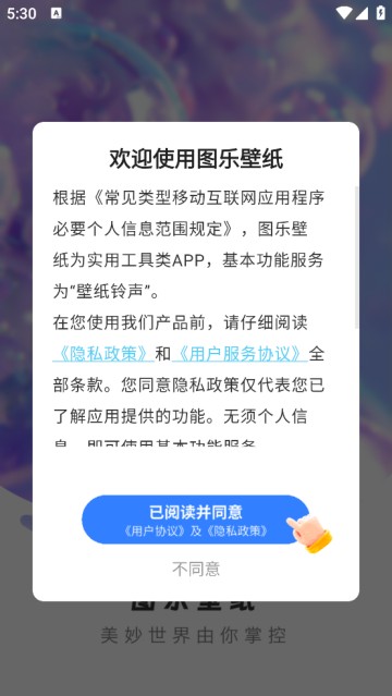 1、打开图乐壁纸软件,点击“已阅读并同意”选项,完成软件初始授权,即可进入应用。