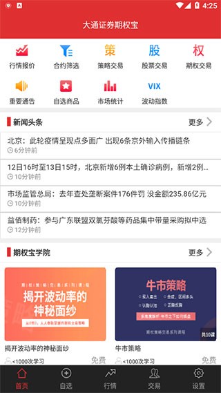 1、打开大通证券期权宝app,首页即可浏览各类财经头条新闻以及丰富的期权宝使用教学视频。