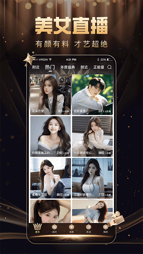【颜值担当】数百位高颜值主播在线与你进行实时互动,满足视觉与交流的双重期待。