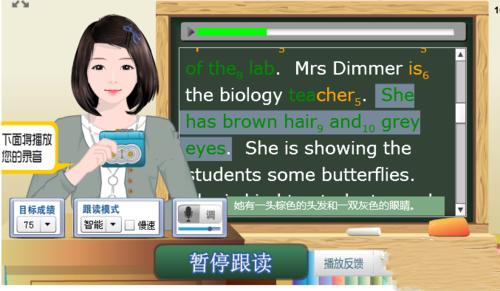 1、课文跟读:播放英文原声,用户模仿朗读后系统自动比对并生成评分结果。