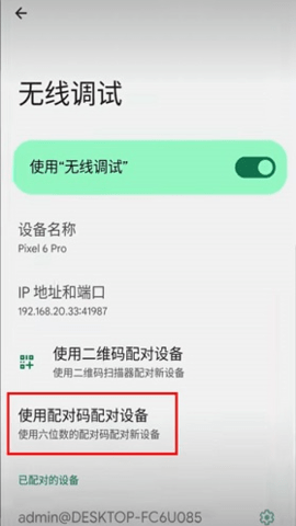 5、点击“无线调试”中的“使用配对码配对设备”。