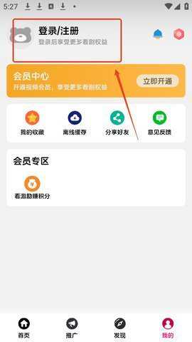 2.打开云云视频app,点击右下角“我的”,再点击上方登录/注册