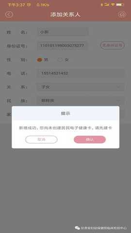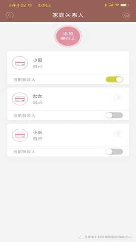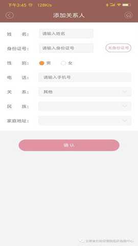 2、 点击最上方【添加关系人】或如果有其他关系人也可以切换, 输入您的姓名,证件号,手机号码,并选择该就诊人与您的关系,点击确定;