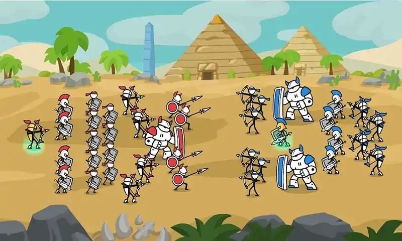 军队战争模拟器游戏是一款火柴人红蓝双方军阵对战手游,玩家会成为其中一方的统帅,在岸边、金字塔等多样地形里面对战,自由谋略,合理的将长枪兵、刀盾兵分布在军阵各处,随着战争的进行,还要不断地调整士兵阵型,最大程度上消灭敌人。