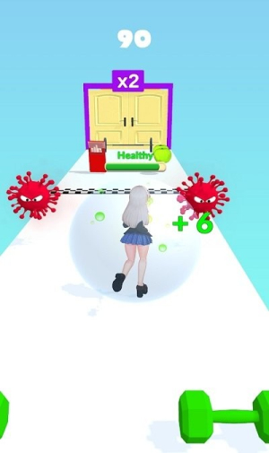2、游戏开始,角色自动向前奔跑,滑动屏幕操控角色躲避前方出现的细菌、病毒等障碍物,避免接触导致角色虚弱减速。