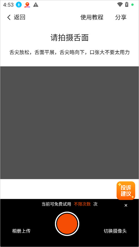 2、按照提示拍摄舌头照片,系统将基于人工智能技术自动进行智能诊断分析,且该功能完全免费向用户开放。