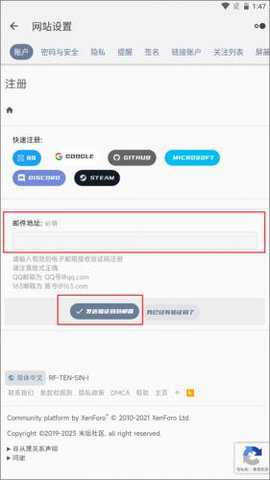 3、在注册界面输入邮件地址并点击下方的发送验证码到邮箱。