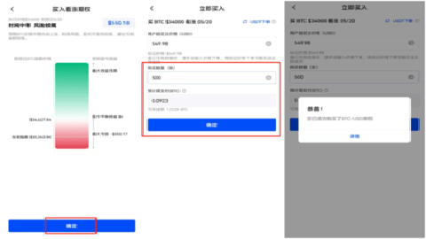 3)选择好期权合约后,二次确定该合约的时间、风险等信息,之后输入购买数量,确定后即委托成功。