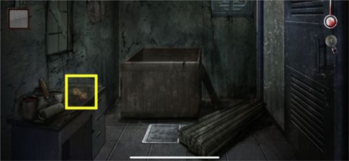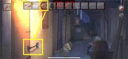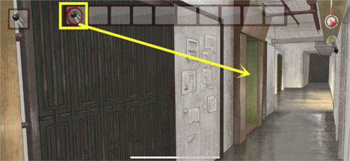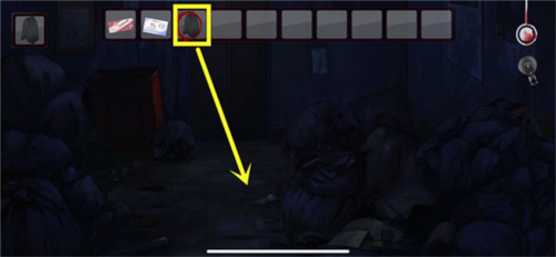 9、然后玩家需要继续前进,对着门上的绳子进行使用【剪刀】,再进门躲起来。