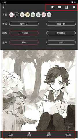 上半部分的图标则关联着核心功能:‘收藏’便于日后重温,‘书架’让你快速访问已保存书籍,‘设置’菜单内藏玄机,允许自定义阅读环境,包括调整背景颜色、字体样式及大小,确保阅读时既舒适又个性化。这样,无论是在明亮的日光下还是夜晚的床头灯旁,你都能享受最佳的阅读体验。