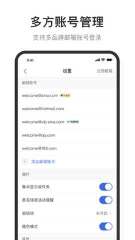 不仅支持新浪免费邮箱及VIP邮箱,还全面支持qq、163、126、outlook、hotmail等各大邮箱。