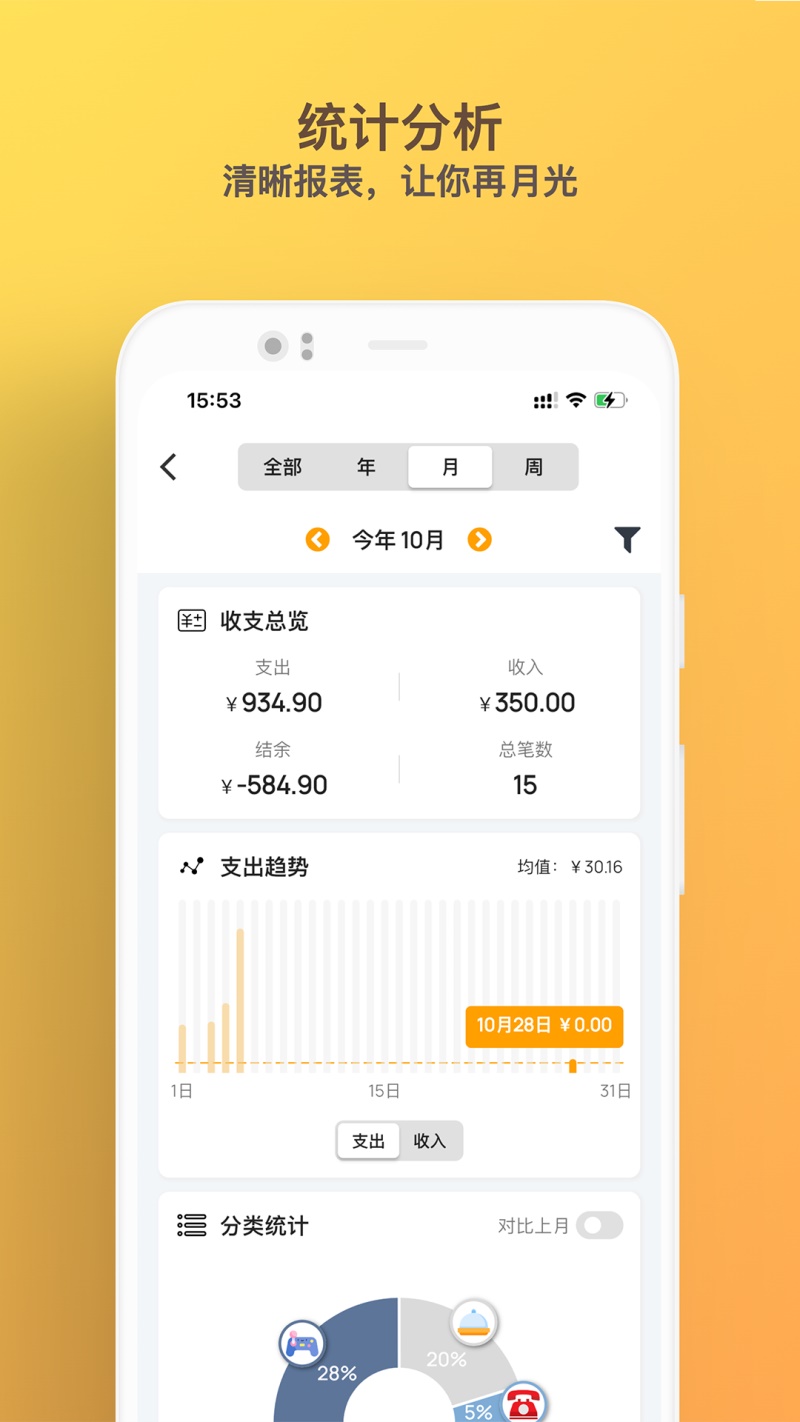 一目了然的图表,帮你快速分析消费情况,快速对比上期收支;