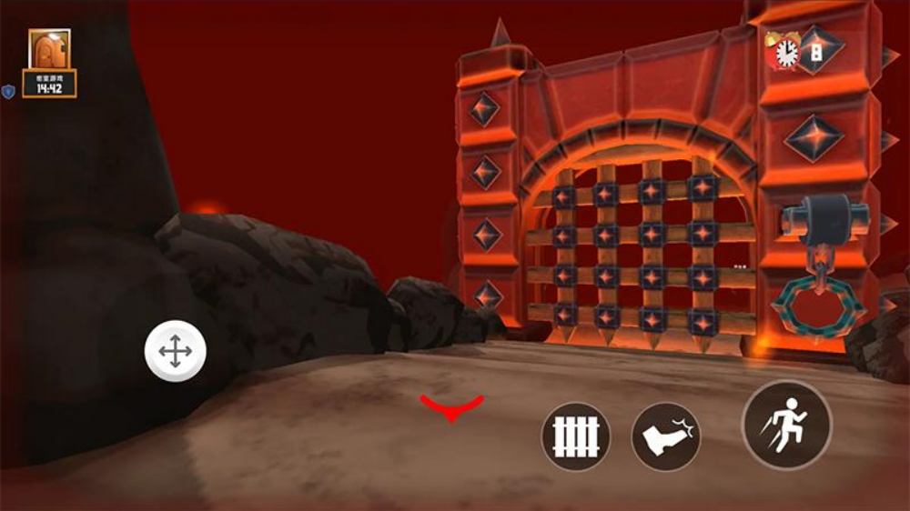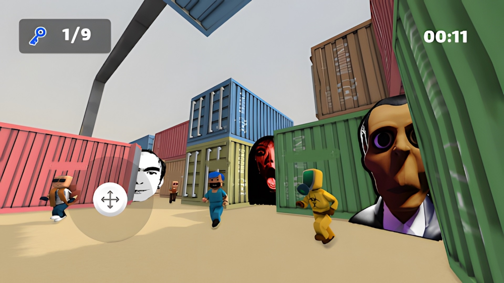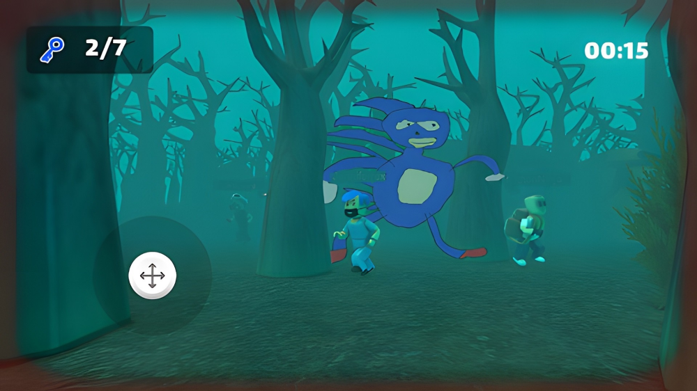 1、使用摇杆操控角色的移动方向,躲避恐怖角色的追击;