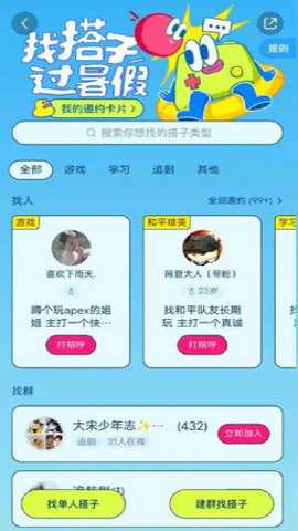 2、建群找搭子的玩法与单人找搭子类似,只是用户可以一起建立一个群聊,与更多的人进行兴趣社交。