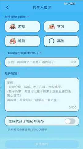 1、然后,用户可以用一句话来描述自己想要找的搭子类型,并生成一篇找搭子笔记进行发布。