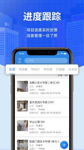 项目流程管理:所有项目流程在待指派、待测量、待安装、待验收、已验收、已关闭过程中可以查看和编辑。