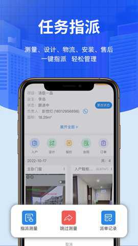 3、用户还可以进行蓝牙智能卷尺的拍照测量,通过创建项目、指派测量、测量完成、指派、完成、项目验收和项目关闭等步骤,实现装修测量的高效进行。