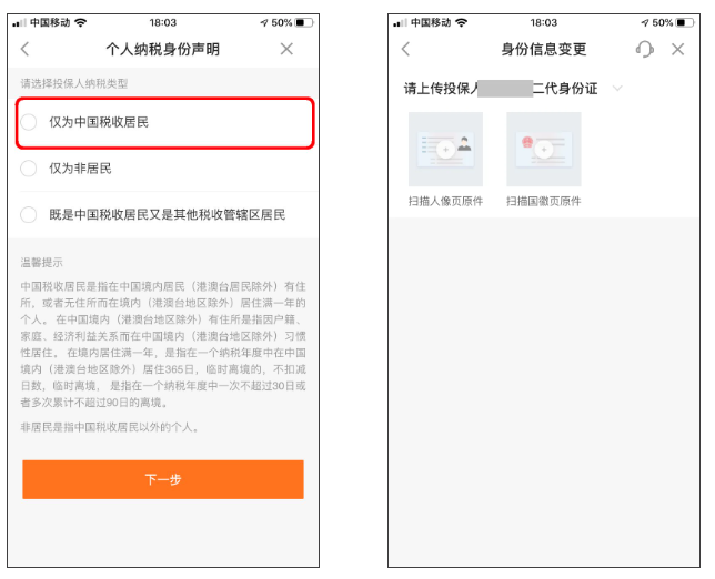 4.身份证用户选择仅为中国税收居民,上传二代身份证原件。