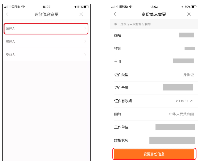 3.选择变更对象投保人/被保人/受益人,点击变更身份信息。