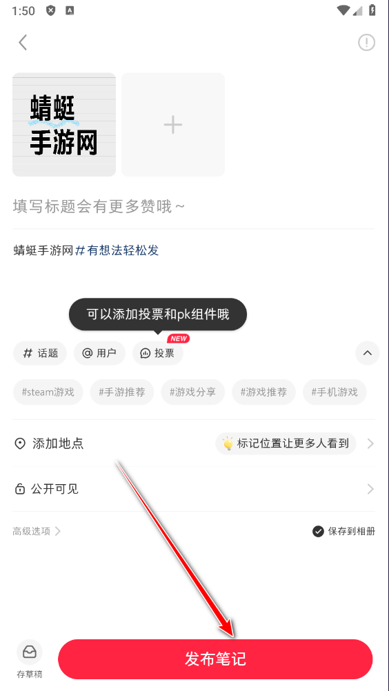 填写标题和内容,点击发布笔记即可