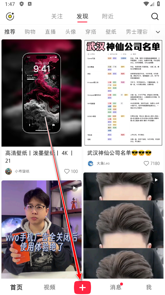 打开小红书app,点击右下方中间的+号