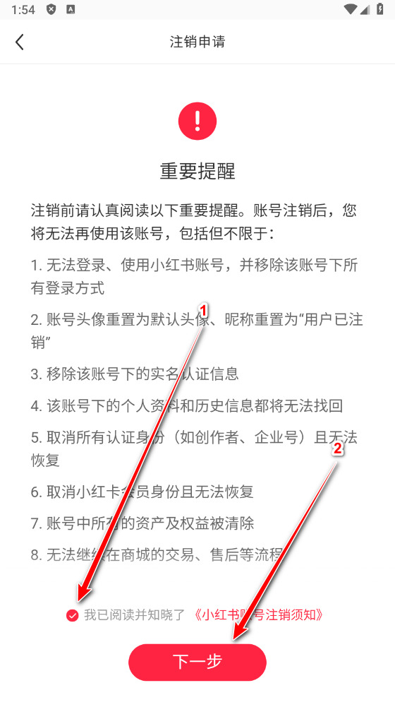 勾选我已阅读并知晓了小红书账号注销须知,并点击下一步