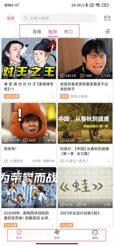 Play版顶部只有直播、推荐以及热门三个板块;底部 Tab 栏只有首页、动态以及个人主页三个板块。