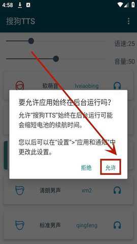 1.下载安装并打开搜狗tts app,点击【允许】给予软件权限