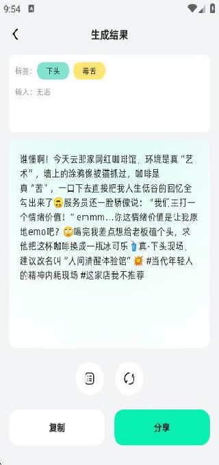6、支持文案复制与分享功能,生成后可直接用于各类社交平台,便捷实用。