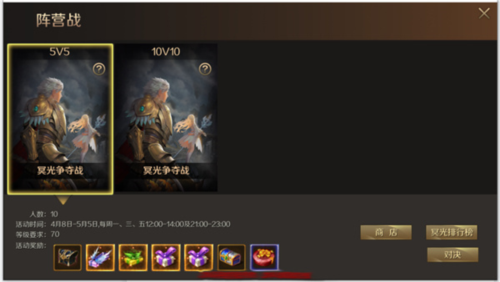 5v5模式下,每个阵营均可容纳5人,争夺战开启时间为每周一、三、五12:00-14:00及21:00-23:00时段;10V10模式下,每个阵营均可容纳10人,争夺战开启时间为每周二、四、六12:00-14:00及21:00-23:00,以及周六、周日12:00--15:00及21:00--24:00时段。