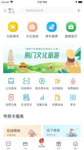i荆门电子健康卡是一款i荆门便民app应用。它提供了丰富的功能和服务,让用户的生活更加便捷和舒适。 i荆门电子健康卡的在线商城功能支持线上购物。它提供了扫码乘车、文化旅游、停车缴费、健康医疗、公交查询、全民健身、电费缴纳、话费充值、优惠加油等功能服务,为用户带来一站式便利的生活服务体验。