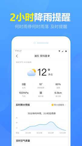 2、特别是在雨季来临时,天气多变,该应用可以为用户提供短时雨雪预报,让用户可以清晰地了解未来两小时的雨雪变化情况。