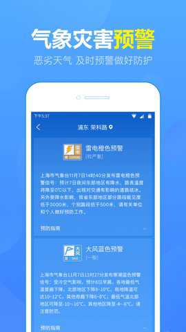 3、此外该应用还可以提供天气及时提醒,包括恶劣天气预警和全面覆盖市县区乡镇的精准预报,让用户可以及时了解天气变化情况,从而更好地保护自己的安全。