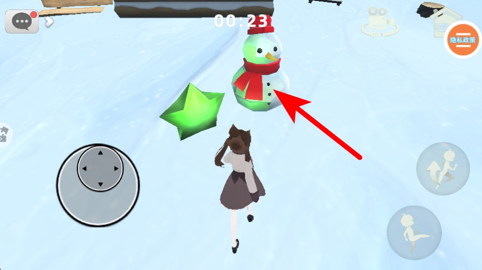 进入雪地场景后,按照红色箭头的指引前进,操控角色靠近雪人等目标物品,完成场景中的互动任务,以此积累探索进度。