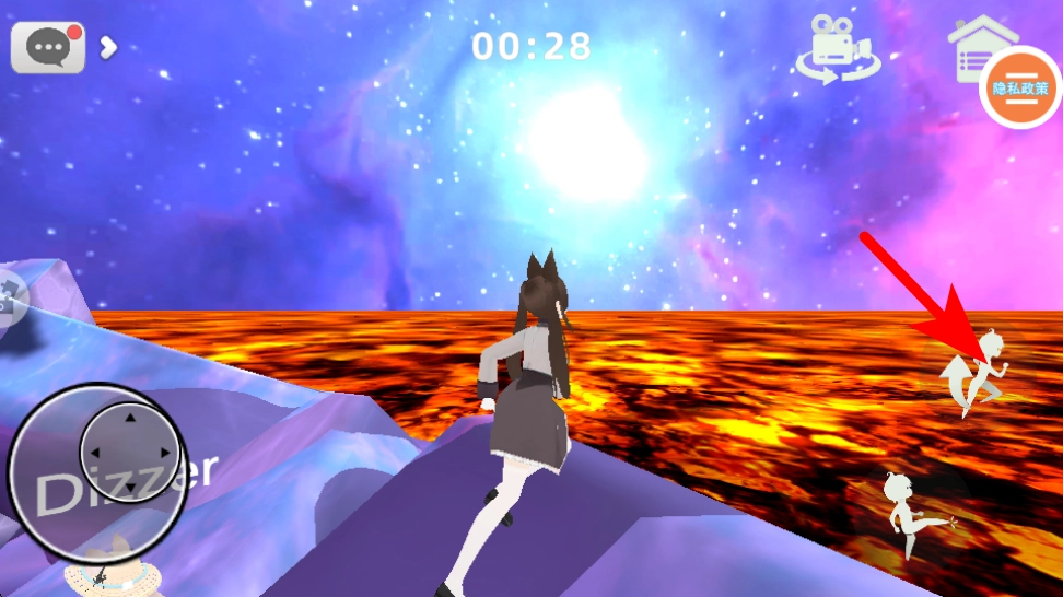进入星空岩浆场景后,按照红色箭头的指示行动,通过操作移动按钮来操控角色,避开岩浆覆盖的区域,朝着安全的平台方向移动,达成任务目标。