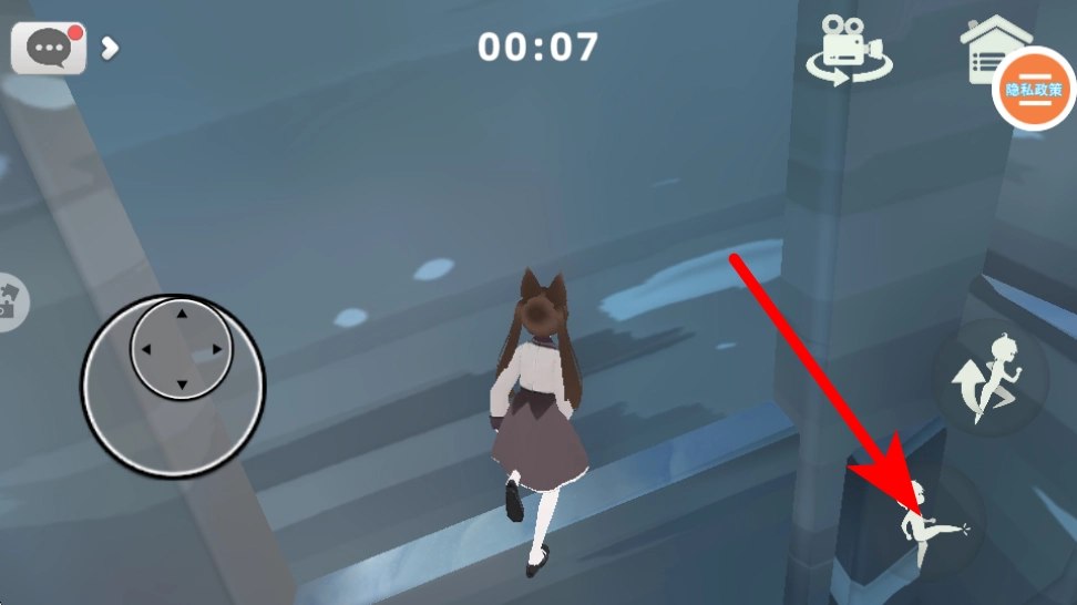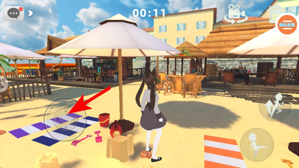 切换至沙滩场景后,按照红色箭头的指示,利用摇杆来调整角色的位置,让角色靠近场景里的沙具等道具,通过收集这些道具来推动玩法进程。