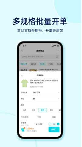 3、它具备一键添加商品、自动带出最新商品信息、极速开单、多规格批量开单等特点。