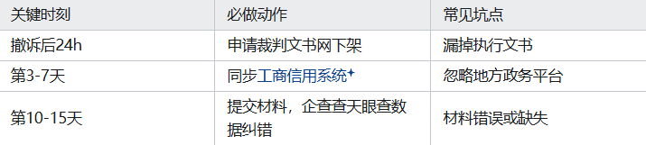 照着这张表操作节省企业时间:关键时刻必做动作常见坑点撤诉后24h申请裁判文书网下架漏掉执行文书第3-7天同步工商信用系统忽略地方政务平台第10-15天提交材料,