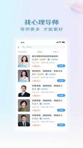 3、用户可以选择在线预约专业心理导师,进行实时语音、视频或文字交流,获得个性化的心理建议,帮助解决心理难题。